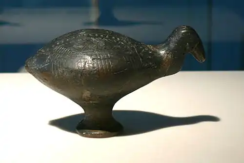 Aus Lönnewitz soll auch die vogelförmige Rassel stammen. Sie trägt einen hohen Standfuß und eine unregelmäßige Verzierung aus Strichreihen und Punktgruppen. Der Kopf ist gebrochen. An den Flanken sind die Flügel und am Hinterteil der Steiß durch tönerne Fortsätze ausgeformt.