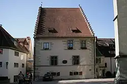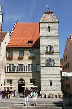Während sich die rückwärtige, zum Münster gerichtete Gestaltung des neuen Amtshauses noch bescheiden zeigt, so öffnet sich in Richtung Hofstatt, zur weltlichen Seite, die architektonische Raffinesse des Neubaus. Er wurde so platziert, dass er mit seiner Hauptfassade zusammen mit dem Pfennigturm die Hofstatt mit einer bühnenartigen, zentralen Lage ganz im Sinne idealer Plätze der Frührenaissance, abschließend vom profanen Marktplatz (Hofstatt) und öffnend zur sakralen Kirche (Münster) dominiert. Der zur selben Zeit fertiggestellte Münster-Nordturm überragt, zusammen mit dem unfertigen Münster-Südturm, direkt dahinter die stadtbildprägende Kulisse von Bauwerken und Platz. So erinnert der Neubau und die gesamte Lage an einen italienischen Palazzo. Anders als die zeitgenössischen, oft giebelständigen, vergleichbaren Bauten in der Region (Ravensburg, Lindau), hat das Gebäude wegen der dreiachsigen Fassade mit einer höher liegenden vierten Achse eher Ähnlichkeiten, die in der Schweiz anzutreffen sind (Schaffhausen, Luzern).