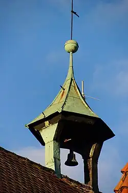Der zweigeschossige Sandsteinquaderbau mit Satteldach und offenem Dachreiter mit Glocke hat an der Südseite ein Zwerchhaus mit Schweifgiebel und türmchenartige Gauben mit Zeltdächern.