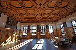 Im zweiten Obergeschoss des Augsburger Rathauses gelegen, umfasst der Goldene Saal eine Fläche von 552 m² bei einer Deckenhöhe von 14 Metern. Mit seinen beeindruckenden Portalen, den üppigen Wandmalereien, ausgeführt von Matthias Kager und nicht zuletzt der prachtvollen Kassettendecke galt er schon zu Zeiten seiner Entstehung als Höhepunkt künstlerischer Innenraumgestaltung.[7] Seinen Namen bezieht der Saal von dem reichhaltigen Goldschmuck, der seine Einrichtung ziert.