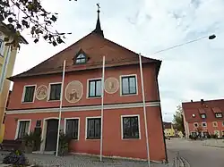 Die Fresken stammen von der Renovierung von 1791. Sie zeigen an der Ostseite das Wappen von Pfalz-Neuburg, die Figur der Justitia und das Marktwappen. An der Nordseite befindet sich das Wappen der Ehrenfelser mit sieben königsroten Rauten und das Wappen der Stauffer zu Ehrenfels. Durch Tiefflieger 1945 wurde das Gebäude geschädigt, 1975 wurden die Fassaden und Fresken von dem Kunstmaler Walter Hagen renoviert. In der Mitte befindet sich eine Inschrift in Latein: