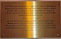 Das Rathaus war am 2. Oktober 1922 auch Schauplatz des Marsches auf Bozen, mit dem die Faschisten den frei gewählten Bürgermeister Julius Perathoner und den Stadtrat gewaltsam zur Demission zwangen.[3] Im Jahr 2012 gedachte die Stadtverwaltung der Ereignisse durch Anbringung einer mahnenden Gedenktafel.[4]