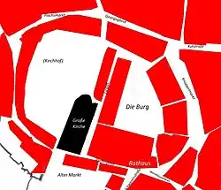 Das alte Rathaus bestand aus zwei Gebäuden, wobei eines der Häuser die Reste der alten Pfalzanlage darstellte, welche während der Feuersbrunst im Jahre 1283 fast unversehrt blieben. Auf dem Plan des Corpurtius aus dem Jahre 1566 ist das Gebäude mit dem Buchstaben „M“ markiert. Nach Norden war der Burgplatz durch die so genannte Schupkuylenstraete und mit beidseitiger Häuserbebauung versehen begrenzt. Der Name verweist auf die Bestrafung des „Schupfen“, wonach der Delinquent in ein Wasserloch gestoßen und untergetaucht wurde. Mitte des 17. Jahrhunderts erhielt die Straße den Namen „Graat“, abgeleitet vom lateinischen Namen „gradus“ für „Stufe“. Die Straße war von der Pfeffergasse nur über Treppen zu erreichen. Nach Osten hin war der Platz durch etwa 10 Häuser begrenzt, die südlich des Platzes gelegene doppelte Häuserreihe ließ damals noch den Verlauf der Burgbefestigung erkennen.