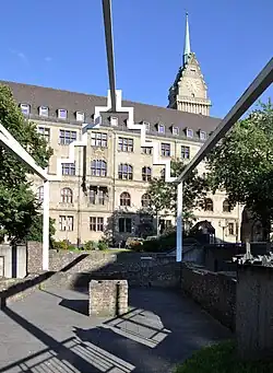 Während des Baus des neuen Rathauses versuchte der Berliner Pfalzenforscher Konrad Plath Beweise dafür zu finden, dass Duisburg das bei Gregor von Tours erwähnte Dispargum mit der Pfalz des frühfränkischen Königs Chlodio auf dem Burgplatz in Duisburg sei. Er entdeckte am Rande des Burgplatzes Mauerzüge, die sich als Überreste der mittelalterlichen Königspfalz erwiesen. Seine Forschungen hat Plath nie veröffentlicht, aber seine Aufzeichnungen blieben erhalten. Sie bildeten die Grundlage weiterer Untersuchungen im 20. Jahrhundert. Am 3. Mai 1902 wurde das neue Rathaus des Karlsruher Architekten Friedrich Ratzel eingeweiht. In den Jahren 1897 bis 1902 hatte sein Ratssaal eine künstlerische Ausstattung durch Gemälde der Düsseldorfer Akademie-Professoren Claus Meyer und Willy Spatz erhalten, etwa zum Thema des versuchten Überfalls durch den Kölner Erzbischofs Dietrich II. von Moers im März 1445 im Rahmen der Soester Fehde und zur Gründung der Universität Duisburg am 14. Oktober 1655.[8] Die Baukosten betrugen insgesamt 2,6 Millionen Goldmark, ein Drittel des jährlichen Budgets der Stadt. An der Nordostseite wurde zudem 1902 eine 4 Meter hohe Rolandsfigur aufgestellt.[9]
