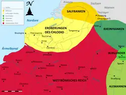 In der spätmerowingischen Chronik, der Liber Historiae Francorum wird berichtet, dass Chlodio, der König der Salfranken in einem Kastell namens Dispargum seinen Herrschersitz hatte. Von dort aus überquerte er mit seinem Heer den Rhein, tötete die römische Bevölkerung und vertrieb sie. Laut dem deutschen Historiker und Archäologen Joseph Milz kann es sich bei diesem Dispargum aufgrund dieser Quelle und anderer Quellen vom 8. bis zum 12. Jahrhundert nur um das heutige deutsche Duisburg handeln, an dessen Stelle sich das Kastell des Chlodio befand.[2] Dieses Kastell befand sich an der Stelle des heutigen Rathauses und des heutigen Burgplatzes und lässt sich auf eine römische Anlage auf dem Burghügel am Rhein zurückführen, auf der im 9. Jahrhundert die Duisburger Königspfalz gebaut wurde. Königspfalzen galten als temporäre Residenzen des Herrschers, der diese auf seinen Reisen durch sein Reich nutzte.