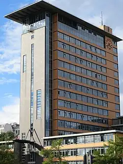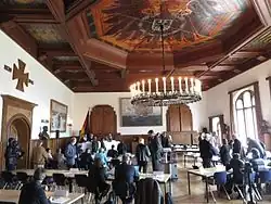 Der Stadtpräsident und der zweite Bürgermeister haben ihre Büros im Hauptgeschoss des Rathauses. Der Oberbürgermeister und auch der Bürgermeister hatten dort zeitweise ebenfalls ihre Büros, residieren aber seit 2012 wieder im obersten, dem 13. Stockwerk, wo die Mitarbeiter seit jeher ihre Büros haben.[26] Ratssaal, Sitzungsräume und Fraktionsgeschäftszimmer befinden sich ebenfalls im weiter unten liegenden Hauptgeschoss. Im darunter liegenden Erdgeschoss befinden sich weitere Fraktionsgeschäftszimmer sowie die Bürgerhalle und der Europa-Raum, ein Tagungsraum. Der Neujahrsempfang der Stadt findet im nahegelegenen Deutschen Haus statt.[27]