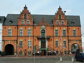 Es handelt sich um einen traufständigen, zweigeschossigen Bau auf hohem Sockel in den typischen Formen der Nordischen Renaissance. Er ist in Backstein errichtet und mit Sandsteinelementen gegliedert. Die Front zieren zwei hohe Zwerchhäuser mit geschweiften Giebeln, die einen kleineren geschweiften Mittelgiebel einschließen. Das Hauptportal wird über eine zweiseitige Freitreppe erreicht. Auf beiden Seiten führen zwei große Durchfahrten zu den dahinter liegenden Straßen.