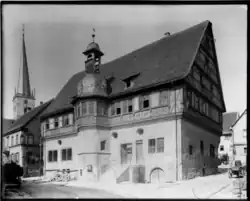 Das heutige Rathaus in Fachwerkbauweise wurde 1579 auf den Grundmauern eines Vorgängerbaus errichtet. Es wurde als Repräsentationsbau von keinem anderen Gebäude der Stadt übertroffen. Im 19. und 20. Jahrhundert fanden umfangreiche Renovierungsarbeiten am Gebäude statt. Die Kaufhalle der Metzger und Bäcker im Untergeschoss, durch zwei rundbogige Tore zu erreichen, wurde dabei mit Wänden verbaut.