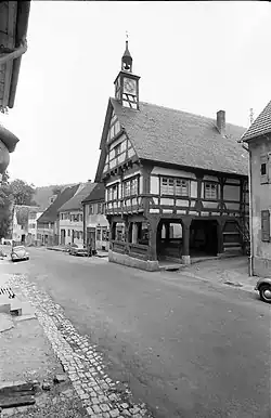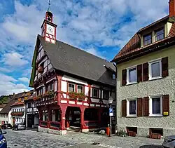 Der zweigeschossige Fachwerkbau mit Satteldach besitzt eine offene Säulenhalle im Erdgeschoss, wo Salz und Getreide verkauft wurden, und einen Dachreiter. Die Glocke im Dachreiter trägt die Jahreszahl 1416. Sie ist mit der Inschrift: „dies Gloegli machet Hans Klain in rotwil anno MCCCC XVI“ versehen. Von 1802 bis 1845 diente das Rathaus auch als Schulhaus.