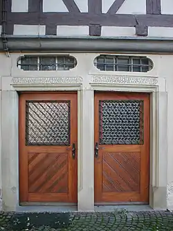 Die Inschrift über den Eingangsportalen lautet: „Durch Gottes Segen ist undernachgesezen Vorstehern dises Rathhaus von der Gemeinde erbaut HSH: Christian Bleimayer + H BM: Ihan Georg Kern + H: Gr:Schr: MichaelHörmann. Ao 1738“.