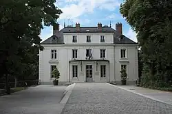Das zweigeschossige Gebäude mit vier zu zwei Fensterachsen wird von einem englischen Park umgeben.