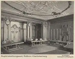 - ↑ Magistratssitzungssal des neuen Rathauses zu Charlottenburg. In: Vossische Zeitung. 21. August 1905 (linke Spalte, dritter Abschnitt von oben).