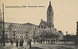 Nach Ausschreibung eines Architektenwettbewerbs[5] wurde zwischen 1899 und 1905 der neue repräsentative Monumentalbau mit diversen Empfangsräumen, Sitzungs- und Festsälen nach Plänen der Architektengemeinschaft Heinrich Reinhardt und Georg Süßenguth errichtet. Allein der Sitzungssaal kostete 100.000 Mark, der Magistrats-Sitzungssaal 25.200 Mark. Der Rathausturm[6] überragte mit einer Höhe von 88 Metern die Kuppel des Schlosses Charlottenburg deutlich. Die Hauptfassade an der Berliner Straße, der heutigen Otto-Suhr-Allee, hatte eine Ausdehnung von 70 Metern und wurde mit Stilelementen des Historismus gestaltet; das Gitter des Hauptportals weist Formen des Jugendstils auf. Die Seitenflügel im Westen und Osten waren jeweils 133 Meter lang. Die Kosten für den Bau betrugen 4,147 Millionen Mark (kaufkraftbereinigt in heutiger Währung: rund 32,05 Millionen Euro). Das neue Rathaus wurde am 20. Mai 1905 zur 200-Jahr-Feier Charlottenburgs eingeweiht.