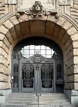 Das Eingangsportal im Mittelrisalit ist mit einem schmiedeeisernen Schmuckgitter von A. M. Krause versehen. Darüber erhebt sich die geschwungene Loggia des früheren Oberbürgermeisterzimmers, neben der die allegorischen Figuren der Weisheit und der Gerechtigkeit des Bildhauers August Vogel angebracht sind. Der Risalit wird mit einem Dreiecksgiebel abgeschlossen, in dem ein von Ernst Westpfahl gestaltetes Relief mit den Darstellungen der Stadtwappen, der Pallas Athene, einem Gebäuderelief und Symbolen des preußischen Königshauses eingearbeitet sind.[9]