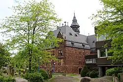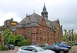 Das steile Zeltdach mit Mansardgeschoss ist mit Schiefer gedeckt. Das Eingangsportal, in das man über eine breite Treppe gelangt, ist mit einem schmiedeeisernen Rankwerkgitter mit vergoldeten Elementen geschmückt. Die Gitter und der leicht geschwungene Übergang zwischen Wand und Ratssaalbalkon nehmen Jugendstilformen und germanisierendes Flechtwerk mit Knotenmustern auf.[5]