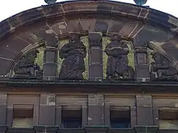 Giebelrelief des Alten Rathauses in Dillingen/Saar mit Allegorien von Erz- und Steinkohleabbau (flankierende Zwerge), Eisenindustrie (rechts) und der Gemeinde Dillingen (links)
