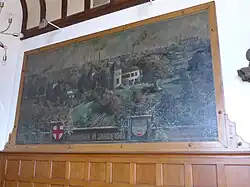 Dillingen/Saar, Alter Ratssaal, Gemälde „Die Rückkehr der Herren von Siersberg und Dillingen von der Belehungsfeier in der Liebfrauenkirche zu Trier am 17. Januar 1333“ von Otto Günther-Naumburg mit Wappengalerie