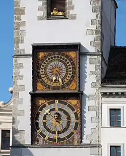 Ein böhmischer Löwe, der sich oberhalb der Uhren in einer gotischen Öffnung befindet, sollte im Mittelalter um Mitternacht mit Hilfe eines Orgelwerks durch sein kräftiges Brüllen Diebe verscheuchen. Er wurde 1564 erstmals urkundlich erwähnt.[1]