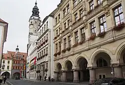 Neues Rathaus am Nordteil des Unter­marktes, links das Hotel Börse