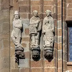 Die symbolhafte Darstellung von jeweils drei mächtigen Vertretern der Heilszeitalter des Augustinus zeigen von rechts beginnend: Die Heiden Alexander der Große, Hektor und Julius Cäsar, die Juden Judas Maccabeus, David und Josua sowie die Christen Gottfried von Bouillon, König Artus und Kaiser Karl den Großen. Die an der Nordseite angebrachten acht Prophetenfiguren stammen aus der Zeit um 1410, sie zierten früher die angrenzende Prophetenkammer. Auch das Portal des Hansasaales stammt von Melchior von Reidt (um 1600).[12][14]