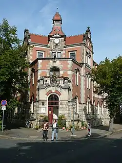 Der zwei- und im Eckteil zur Schauseite hin dreigeschossige Neubau (das dritte Geschoss ist ansonsten als Mansarde ausgebildet) im Stil der Neorenaissance wurde mit einem Sockelbereich aus Sandstein versehen, darüber besteht es aus Ziegeln und Klinkerziegeln, z. T. mit Sandsteinverblendungen.[1] Der Schaugiebel wurde mit einem vorgesetzten Eckbalkon und einem Uhrturm mit Uhr und einem kleinen Portalturm geschmückt, über dem Uhrturm wird das Biberschwanzdach durch ein Telefontürmchen gekrönt.