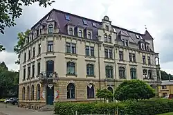 Das Gebäude wurde in den Jahren 1900 und 1901 als Rathaus für die damals selbständige Gemeinde Niederhäslich gebaut. Es hat einen Grundriss von ca. 30 × 15 Metern und fünf Geschosse, davon zwei Dachgeschosse. Die Front zur Poisentalstraße hin besteht aus sieben Fensterachsen. Dort befindet sich auch der Haupteingang des Gebäudes. Gestalterisch weist das Rathaus späthistoristische Renaissanceformen auf. Die Ecke an der Kreuzung wird mit einem Türmchen betont. An der Seite zur Rudeltstraße befindet sich der Eingang zum früheren Ratskeller.