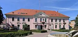 Der zweigeschossige Bau trägt ein Walmdach und verbindet in seinen Bauformen den barocken Klassizismus mit Details des Rokoko. Die symmetrischen Fassaden haben ein Sockelgeschoss, das von einem profilierten Gesims unter der Traufe gekrönt wird, und werden von hohen Pilastern eingerahmt. Die elfachsige Fassade ist durch einen dreiachsigen Mittelrisalit betont.