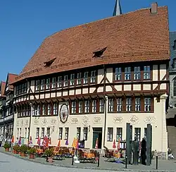 Das Rathaus steht unter Denkmalschutz und ist mit der Erfassungsnummer 094 30303 im Denkmalverzeichnis eingetragen.[3] Die Größe des Bauwerkes zeugt davon, dass die Stadt einst sehr viel mehr Einwohner hatte als heute.[4] Markant ist der zweifache Knick in der Fassade, der sich an die Straße anpasst, sowie das steile, überkragende Satteldach. Die Obergeschosse sind nur von außen über eine Treppe zugänglich, die rechts an dem Gebäude vorbei zur Stadtkirche hinauf führt.[2] So ersparte man sich beim Ausbau ein eigenes Treppenhaus. Als größte Besonderheit gilt die Anpassung der Architektur an den Kalender. Es soll 12 Türen (=Monate), 52 Fenster (=Wochen) und 365 Fensterscheiben besitzen. Diese Zahlen werden heute aber nicht mehr eingehalten. So sollen es mittlerweile 366 Fenster sein.[5] Im Untergeschoss befindet sich der Ratskeller, in den Obergeschossen die Stadtverwaltung. Vor dem Gebäude steht seit dem Jahr 1989 ein Denkmal für den hier um 1489 geborenen Thomas Müntzer.[6]