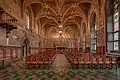 Nach einem Brand 1887 befand sich der Innenbereich des Rathauses in einem schlechten Zustand. Zwischen 1895 und 1905 wurde die Einrichtung gemeinsam von dem Architekten Louis Delacenserie und dem Künstler Jean-Baptiste Bethune restauriert. Der kleine und der große Schöffensaal im Obergeschoss wurden zum gegenwärtigen „gotischen Saal“ zusammengefügt. Die kostbare Verzierung dieses Raums ist der Dekoration der Fassade ebenbürtig. Das imposante doppelte Schirmgewölbe aus Holz wurde restauriert und umfasst den gesamten Saal. Das Gewölbe der beiden östlichen Travéen stammt aus dem 19. Jahrhundert. Die Schlusssteine der Gewölbe enthalten Medaillons und vierlappige Verzierungen mit Abbildungen aus dem Neuen Testament sowie von Propheten, Evangelisten und Heiligen. Die Kragsteine, die das Ensemble unterstützen, wurden mit thematischen Darstellungen der Jahreszeiten, Monate und Naturelemente verziert. An den Wänden hat der Künstler Albrecht De Vriendt Szenen aus der Geschichte von Brügge gemalt. Dabei handelt es sich um zusätzliche Dekorationen im neugotischen Stil, wie auch der monumentale Prunkkamin. Das Steingewölbe aus dem Jahr 1766 in der Halle im Parterre wurde im gleichen Zeitraum durch eine historisierende Holzkonstruktion ersetzt, die von vier kompositen Säulen unterstützt wird, die diesen Saal in zwei Schiffe aufteilen.