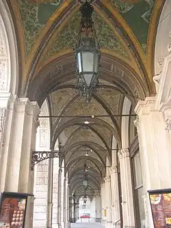 Südlich des Rathauses befindet sich ein Häuserblock mit Arkadenhäusern (Rathausplatz 7–9 / Lichtenfelsgasse 1–3, Seiten Stadiongasse 2 / Bartensteingasse 16), die 1877/1878 von Rathausarchitekt Friedrich von Schmidt und Franz von Neumann in altdeutschen Formen errichtet wurden. Es waren dies die ersten Arkadenhäuser des Rathausviertels, das am 28. März 1878 den Baukonsens erhielt. Dominant sind Kuppeln auf Eckrisalit und Mittelkuppel, Erker, Balkone, Puttenfries und Statuen von Venus und Mars an der Fassade. Im kreuzrippengewölbten Arkadengang liegen Tore mit Halbsäulenportalen und Akroterfiguren. Die Foyers sind unter anderem reich mit Stuckdecken und Groteskenmalerei geschmückt. Bemerkenswert ist der Seiteneingang in der Lichtenfelsgasse 1 mit seinem reich ausgestatteten Foyer.