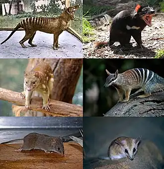 - Die Thylacinidae mit dem Beutelwolf (Thylacinus cynocephalus), der zu Beginn des 20. Jahrhunderts ausgerottet worden ist.