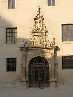 Über dem Portal ist die Inschrift eingemeißelt: DOMUS SAPIENTIAE (Haus der Weisheit). Darüber ist zwischen den leeren Figurennischen das Wappen von Philipp II. von Spanien angebracht. Die beiden kleineren Wappen in den Bogenzwickeln erinnern an den Dominikanerorden.