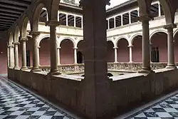 Der quadratische Innenhof ist auf allen vier Seiten von drei Stockwerken offener Galerien umgeben. Der skulptierte Dekor wurde von dem Bildhauer Francisco de Montehermoso geschaffen. Die Arkaden des Erdgeschosses werden von Säulen getragen, in deren Sockel Vasen, Köpfe oder Pflanzenmotiven eingemeißelt sind. Die Fratzen in den Zwickeln der Arkaden sollen Juden oder Mauren darstellen. Die Konsolen der Ecken sind mit den Evangelistensymbolen verziert.