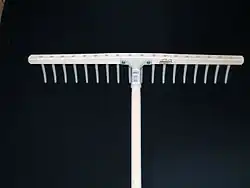 Der Rechen bzw. (oft im nord- und mitteldeutschen Sprachraum) die Harke[1][2] sind Gartengeräte[3] mit einem Stiel, einem quer dazu angesetzten Stab, dem „Holm“ oder „Rechenbalken“, und mehreren kurzen Fortsätzen, den „Zinken“. Das Gerät dient je nach Ausführung zum Zusammenziehen von lockerem Material (Laub, Grasschnitt oder Heu), Furchenziehen für Saatgut oder zum Bearbeiten des Bodens (Lockern, Reinigen von Pflanzenresten und Steinen, Ebnen und Verteilen).[4] Auch zum Verteilen von Materialien wie Kies, Beton oder Bitumenbelag im Straßenbau kann es verwendet werden. Anwendung findet es in der Landwirtschaft, im Gartenbau und im Baugewerbe.