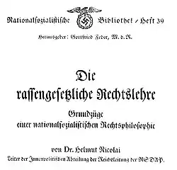 Den gleichen Gegensatz stellte Nicolai schon 1932 in seiner Schrift Die rassengesetzliche Rechtslehre[71] als Gegensatz von römischem und germanischem Recht dar: „Wenn nun der Römer gefragt wurde, was rechtens sei, so […] schlug er das Gesetzbuch auf, […] der alte Deutsche […] konnte sich nicht auf eine Anordnung der Staatsgewalt berufen, sondern mußte sein Gewissen befragen. Er konnte nicht in ein Gesetzbuch schauen, sondern mußte die Antwort aus dem Ideal des Rechts entnehmen, das vor ihm aufgerichtet stand, jenem allgemeinen Rechtsgedanken, der das Gemeinschaftsleben durchherrschte und dem Einzelnen verbindliche Richtschnur sein sollte.“ (S. 10)