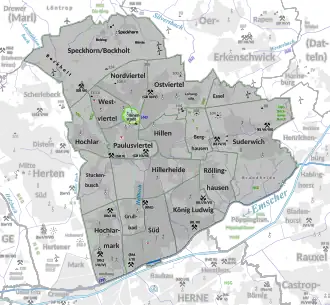 Bevölkerung: Recklinghausen nach Statistischen Bezirken. (PDF; 4,1 MB) In: Statistischer Jahresbericht 2023. Stadt Recklinghausen, S. 16 , abgerufen am 6. Mai 2025 .
