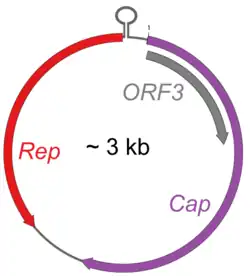 - Ein Replikations-Protein (ORF2: Rep), das wahrscheinlich die Rolling-Circle-DNA-Replikation initiiert.