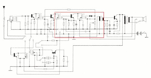 Besser zu durchschauen ist die Schaltung eines japanischen Taschenempfängers aus den 1960er-Jahren. Die vom Empfangssignal im Schwingkreis VC1/L1 hervorgerufene Hochfrequenzspannung erzeugt in der Koppelwicklung L1b eine kleine Spannung, die zur Stromsteuerung der Basis vom Transistor T1 herangezogen wird. Dieser arbeitet als normaler linearer Verstärker in Emitterschaltung. Das verstärkte HF-Signal wird am Kollektor des Transistors, der HF-mäßig auf die Drossel Dr.2 arbeitet, über C6 abgenommen, der HF-Drossel Dr.1 zugeführt und mit der Diode D1 in normalerweise gemeinsam mit einer RC-Kombination am Ausgang demoduliert. Der ohmsche Widerstand ist dabei ein Potentiometer, welches zugleich der Lautstärkeeinstellung dient. Das am Schleifer abgegriffene NF-Signal wird nun über den rot markierten Signalweg zum Koppelkondensator und darüber zum Eingang derselben Stufe zurückgeführt. Dort auftretende Hochfrequenzreste werden mit C3 kurzgeschlossen, die Koppelwicklung L1b wirkt für das NF-Signal praktisch als Kurzschluss. Das in T1 nun nochmals verstärkte, nun aber im NF-Gebiet liegende Signal wird über die Drossel Dr.2, die für die NF ebenfalls fast als Kurzschluss wirkt, zum NF-Transformator Tr.1 geführt. Dieser passt das Signal an den Eingang der mit T2 aufgebauten NF-Endstufe an. Der Kondensator C7 überbrückt die Primärwicklung von Tr.1 hochfrequenzmäßig und trägt zu stabilen Arbeitsverhältnissen bei.
