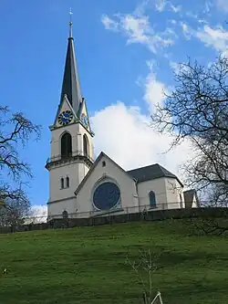 Das Chorfenster wurde 1961 nach einem Entwurf von Hans Peter Eber neu angefertigt. Es zeigt eine stilistische dunkle Erdkugel über der ein gelb-orang leuchtendes Kreuz steht. Es bezieht sich auf die Verse Joh. 8,12, Matth. 28,20, Matth. 11,28 und Joh. 16,33.