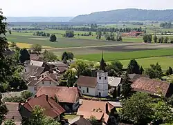 Das barocke Gotteshaus ist als Saalkirche mit nicht eingezogenem polygonalen Abschluss angelegt. Zu betreten ist sie über einen Frontturm, der in den 1830er Jahren erhöht wurde. Die Kirche wird durch Rundbogenfenster und Oculi über den Seitenportalen beleuchtet. Bemerkenswert sind die Grisaille-Malereien von 1676 rund um die Fenster, die an Dünz' Kirche von Gränichen erinnern. Auch das Chorgestühl, die Kanzel und der Taufstein stammen aus der Bauzeit und bilden ein bedeutendes Ensemble. Die Empore stammt aus der Vorgängerkirche und wurde 1812 erweitert. 1946–1947 wurden die Fenster im Schiff mit Glasmalereien von Paul Zehnder versehen.
