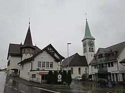 Im Turm hängen fünf 1926 gegossene Glocken der Giesserei H. Rüetschi aus Aarau: