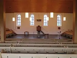 Der Kirchenraum ist seit dem Umbau der 1970er Jahre als Querraum angelegt. Die beiden polygonalen Abschlüsse bilden in der neuen Ausrichtung Querschiffe. In beide Querschiffe wurden Estraden eingebaut, wobei die südliche vollständig bestuhlt ist, während sich auf der nördlichen die Orgel und eine für Konzerte nutzbare Bühne befinden. Ebenfalls fix mit Bänken bestuhlt ist der ostseitige Anbau, während der dazwischenliegende Raum unbestuhlt und somit flexibel benutzbar ist. Zwei Holzpfeiler markieren den Übergang vom alten Kirchenschiff zum ostseitigen Anbau. An der Nordwand befindet sich die Liturgiezone mit der barocken Nussbaumholz-Kanzel mit Schalldeckel aus dem Jahr 1714 ist. Sie ist mit Schnitzereien und Intarsien verziert und verfügt über eine kunstvoll gestalte schmiedeeiserne Stütze für das Lesepult. Das daran angebrachte Medaillon ist auf das Jahr 1714 datiert und trägt die Initialen des damaligen Untervogts Hans Jakob Rellstab.