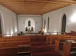 Das Innere folgt dem einfachen Schema einer längsgerichteten Saalkirche mit Turmchor. Im Chor befinden sich zwei reich geschnitzte Kirchenörter von 1814. Das Chorfenster ziert ein Glasgemälde der Kreuzigung Christi von P. Eichenberger aus dem Jahr 1950. Die getönten Scheiben des Kirchenschiffs enthalten das neugotisch gestaltete Gemeindewappen und einen Verweis auf die Renovation von 1857. Von 1821 stammt der Taufstein.