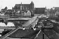 Die romanische und gotische Architektur des Mittelalters bestimmt noch heute das Gesicht der Altstadt. Ein Zeichen für den damaligen Wohlstand der Stadt ist der Bau der Steinernen Brücke von 1135 bis 1146. Das mittelalterliche Bauwunder trug zur weiteren Steigerung des Wohlstandes der Stadt im 13. Jh. bei und wurde zum Vorbild für viele andere Brückenbauten, zum Beispiel für die Judithbrücke (Vorläuferin der Karlsbrücke) in Prag. Die Brücke ist zugleich Symbol für den Aufstieg der bürgerlichen städtischen Selbstverwaltung: Im Brückenprivileg Kaiser Barbarossas vom 26. September 1182 wird mit dem Brückenmeister (magister pontis) Herbord erstmals ein städtischer Funktionsträger namentlich genannt.[22]