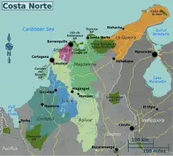 Weitere wichtige Städte sind Santa Marta mit einer Bevölkerung von ca. 600.000 Einwohnern, Montería und Valledupar, Sincelejo und Riohacha, Aguachica und Apartadó sowie Caucasia, Magangué, El Carmen de Bolívar, Maicao, El Banco und Santa Cruz de Lorica.