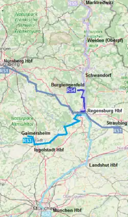 | RS 1 | Nürnberg Hbf – Neumarkt – Parsberg – Regensburg Hbf – Straubing | Bahnstrecke Regensburg–Nürnberg, Bahnstrecke Passau–Obertraubling | 20–40 min bis Neumarkt, 60 min bis Nürnberg |