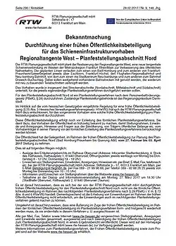 - ↑ Ergebnisbericht zur frühen Öffentlichkeitsbeteiligung. (PDF; 479 kB) In: Regionaltangente West, Planfeststellungsabschnitt Nord, Unterlagen zur Planfeststellung. RTW Planungsgesellschaft mbH, 19. Dezember 2017, S. 9, abgerufen am 10. März 2018.