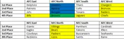 Saison AFC East AFC North AFC South AFC West NFC East NFC North NFC South NFC West