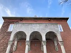 Ursprünglich umrahmten sie eine Reichsadler-Skulptur[4] in der Mitte des Portikus, die nach 1945 entfernt wurde. Die vier Kapitelle aus Muschelkalk der den Portikus tragenden Säulen gestaltete der Bildhauer Paul Merling.