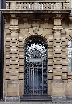 Die denkmalgeschützte Fassade wurde im Stil des Historismus in Anlehnung an florentinische Palazzi im Stil der Renaissance gestaltet: „Die Strassenfront ist in prächtigen Formen der Florentiner Renaissance aus Heilbronner Sandstein fein gegliedert.“[1] So erhebt sich über dem Sockelgeschoss ein hohes Erdgeschoss. Dieses ist mit Rustika, Pilastern und Halbsäulen gegliedert. Darüber erheben sich zwei Obergeschosse mit rustizierten Pilastern und aufwändiger Fensterverdachung. Ein kräftiges Kranzgesims schließt die Fassade nach oben ab.